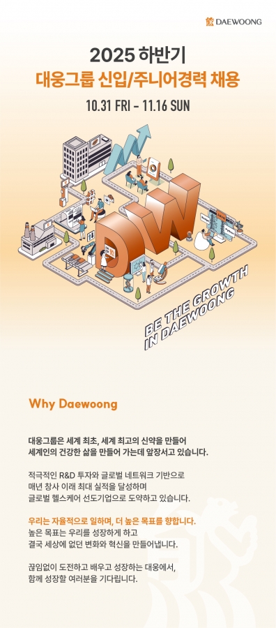 - 지원링크: https://career.daewoong.co.kr/apply/posting?type=%EC%8B%A0%EC%9E%85%2F%EC%A3%BC%EB%8B%88%EC%96%B4%EA%B2%BD%EB%A0%A5