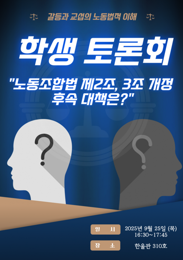 최근 개정된 노동조합법 제2조와 제3조에 대한 후속 대책과 관련된 학생 토론회가 내일(9/25) 진행됩니다.