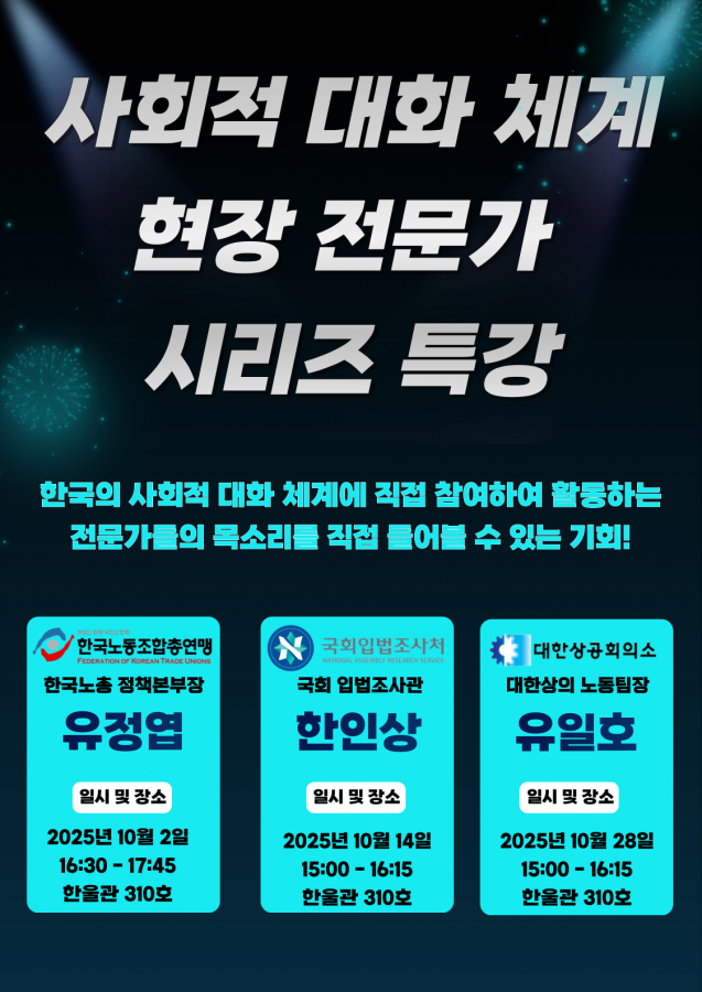 해당 특강은 노사정 사회적 대화와 관련된 내용이며, 법학부 학생분들의 많은 참여 바랍니다.