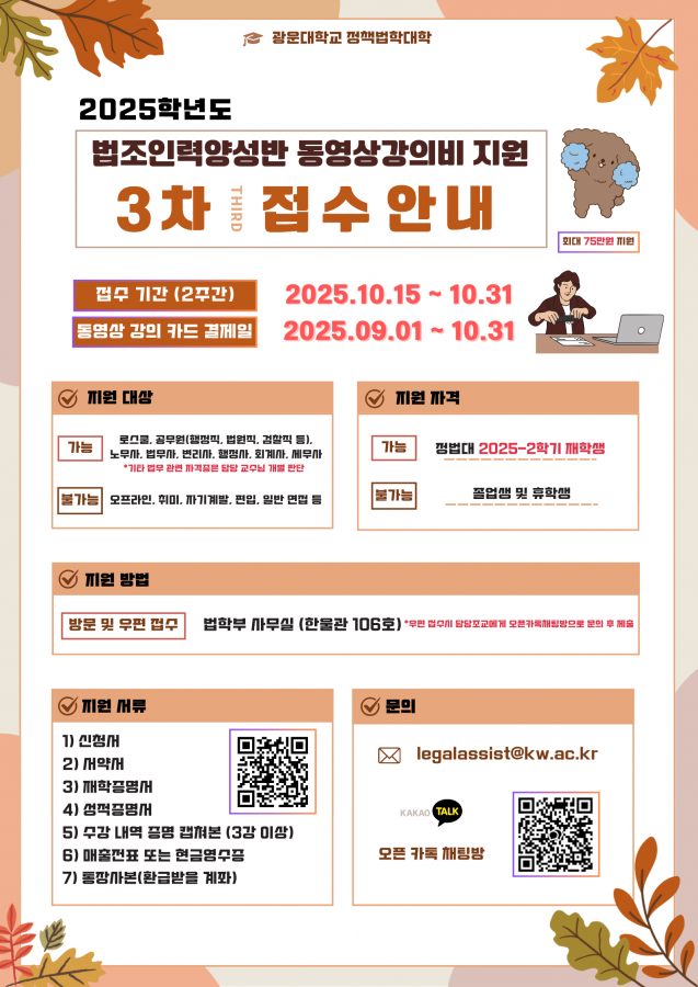 2025학년도 [법조인력양성프로그램]의 일환으로 로스쿨, 공무원, 전문자격증 등 법조 관련 자격증 준비생을 위한[제2차 동영상 강의비 지원(최대 75만원)]을 실시하고자 합니다.
