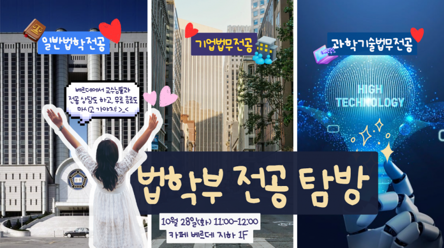 세부전공에 고민이 있는 학생 분들, 전공 관련 고민이 있는 학생 분들, 기타 법학부라면 학년 상관없이 많은 방문을 부탁드립니다.