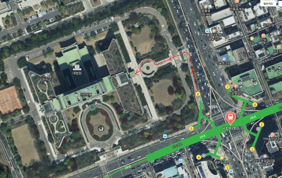 - 지하철 이용 시: 2호선 서초역 6번 출구로 나와서 대법원 동문으로 들어간 뒤에 조형물 뒤쪽 계단으로 올라오면 법원 전시관으로 입장 가능.
