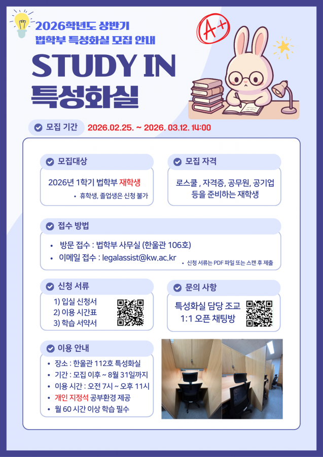 2026학년도 법학부 특성화실 입반 관련하여 안내드리오니 법학부 재학생분들의 많은 관심 부탁드립니다.