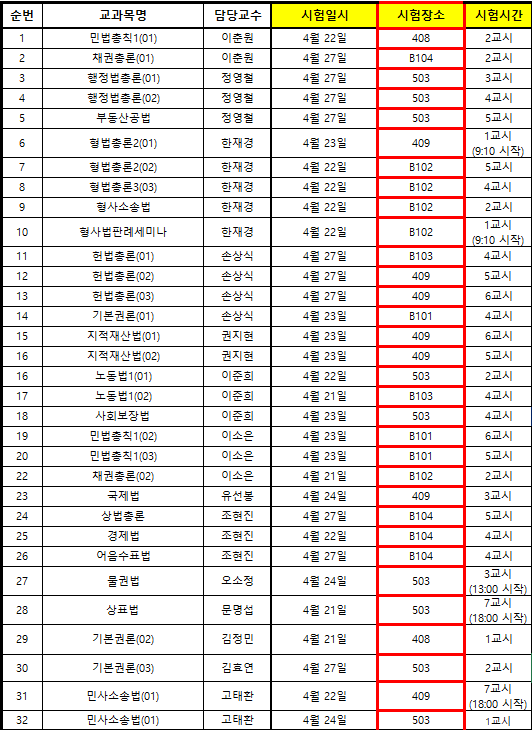 26학년도 1학기 법학부 전공 중간고사 날짜 및 강의실을 안내드립니다.