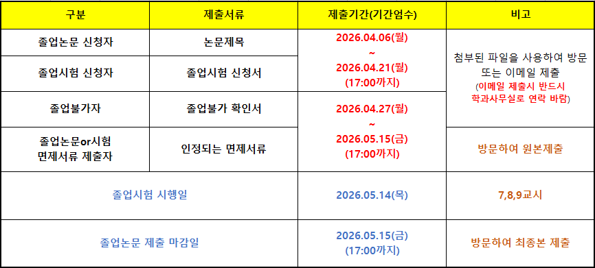- 졸업논문 작성 희망자는 첨부파일[2025학년도 후기(2026년 8월) 논문제목]을 4월 21일(월요일, 17:00)까지 제출(방문 또는 이메일) 해주시기 바랍니다.